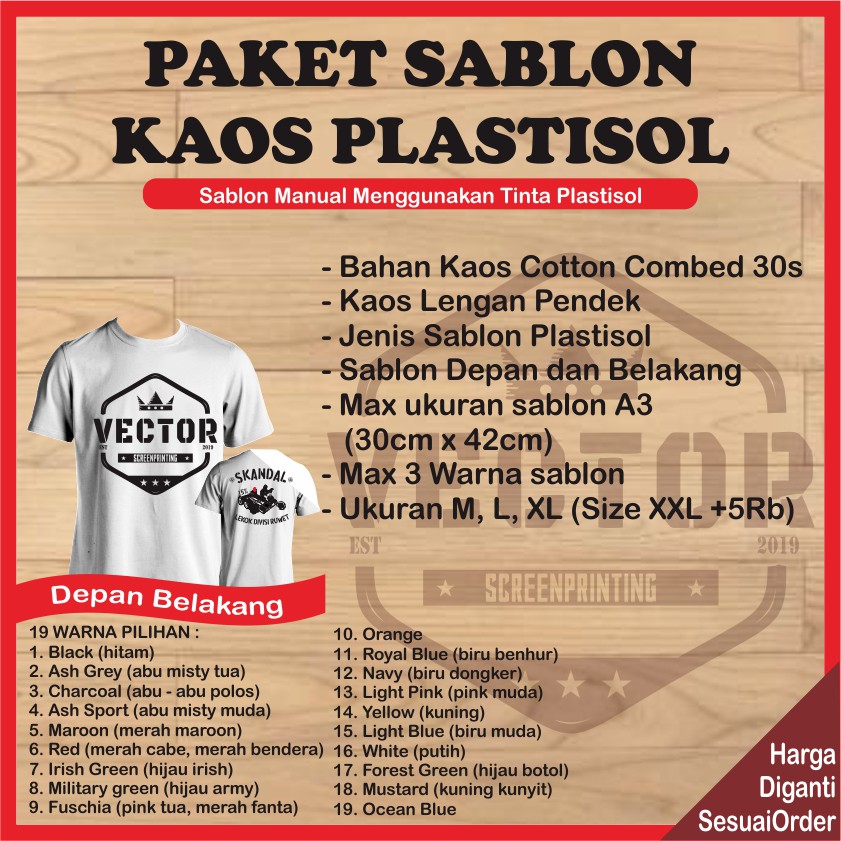 Sablon kaos plastisol cocok untuk sablon ruster yang mengahasil perpaduan warna CMYK. Untuk standard estimasi pengerjaan sablon kaos manual sendiri rata-rata adalah 2 minggu mengingat prosesnya yang lebih banyak daripada sablon digital yang menggunakan mesin digital dan ada minimal naik cetaknya. Cotton Combed 30s 24s By Request Warna Kaos.